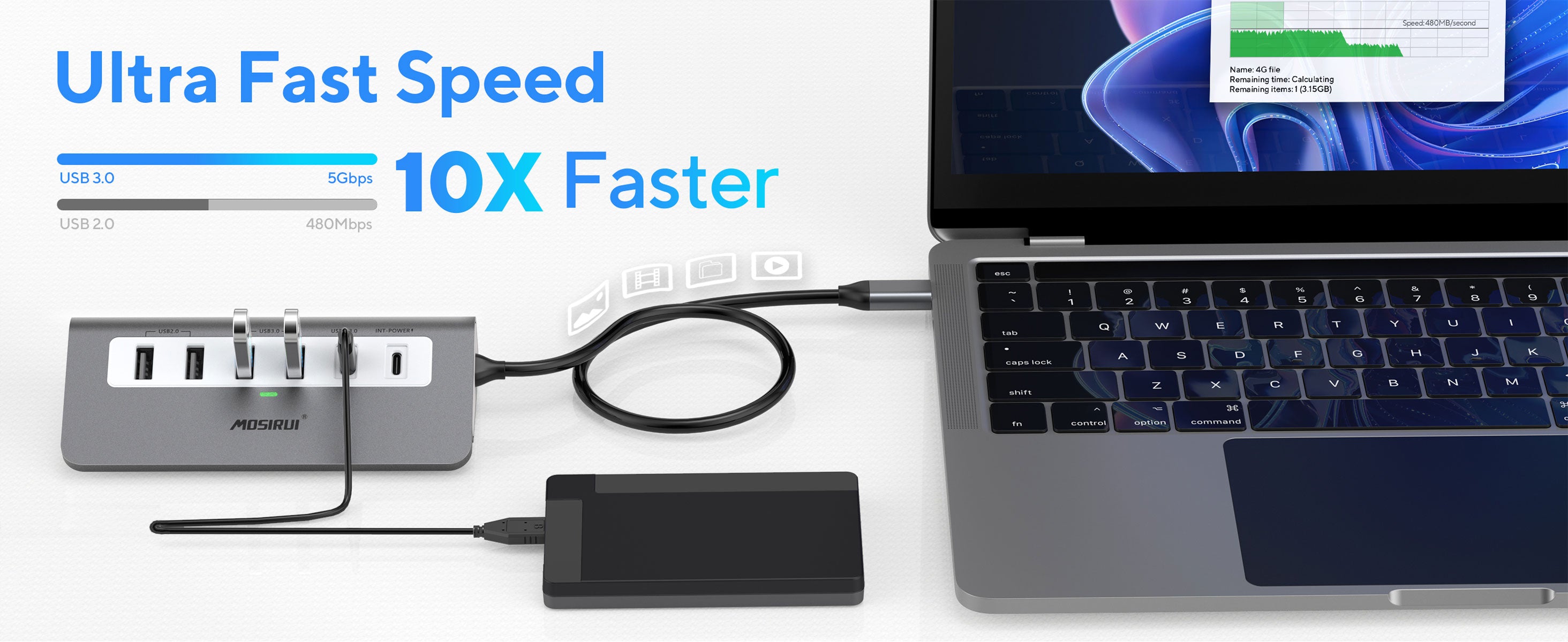 - 5GBPS USB 3.0/USB-C DATA TRANSFER: This USB C Multiport adapter supports 5Gbps high-speed data transmission. Equipped with 2 USB 3.0 & 1 USB-C 3.0, you can connect to USB Disk, Flash Disk, phone and so on to transfer files in second. 2 USB 2.0 ports can be connected to wireless devices to avoid disconnecting, such as keyboard, mouse, USB Fan. Note, both them won't support charging.